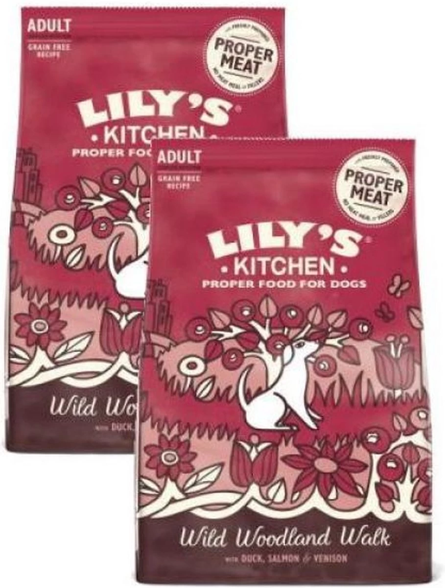 Lily’s Kitchen Dog Adult Duck / Salmon / Venison Hondenvoer Lily’s Kitchen Dog Adult Duck / Salmon / Venison is graanvrij en compleet hondenvoer met vers bereide eend, zalm en hert samen met zorgvuldig gekozen fruit, groenten en plantaardige kruiden. Aan dit recept is glucosamine en chondroïtine toegevoegd voor sterke botten en gewrichten, prebiotica voor een gezonde spijsvertering en essentiële toevoegingen voor de algemene gezondheid van jouw maatje. Zo bevat deze brok zalmolie, wat een fantastische bron van omega 3 en 6 is en helpt om de vacht, hart, hersenen en gewrichten in optimale conditie te houden! Voordelen van Lily’s Kitchen Dog Adult Duck / Salmon / Venison – Enorme boost voor immuunsysteem door omega 3 – Uitstekende ondersteuning voor botten en gewrichten – Prebiotica voor gezonde spijsvertering Voedingsadvies Het voedingsadvies is gebaseerd op een normale energiebehoefte van jouw maatje. De l