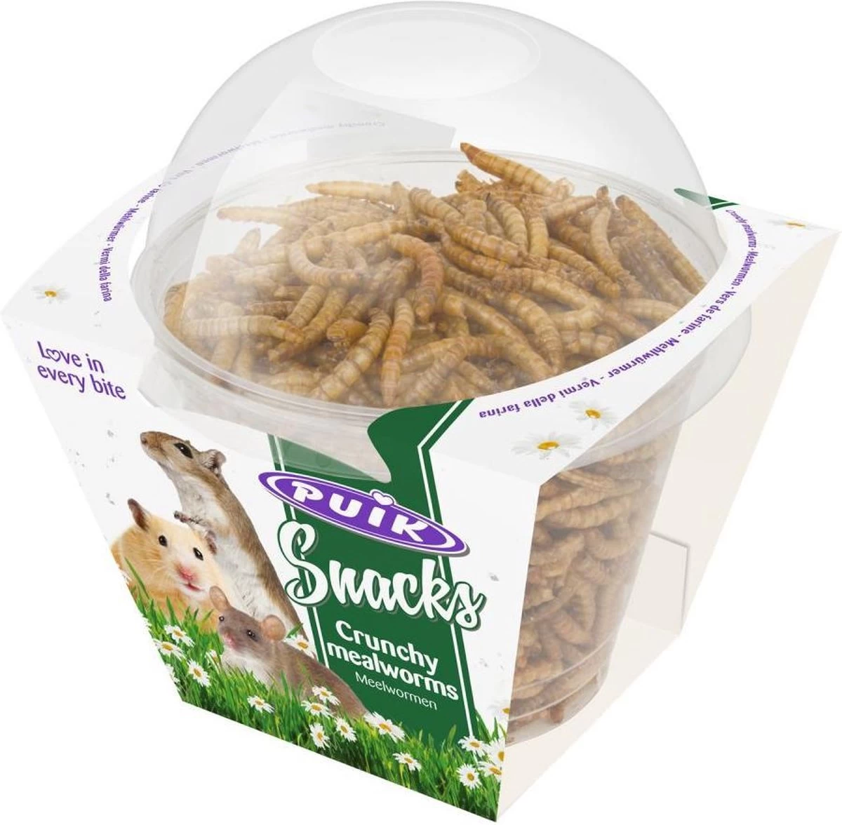 Puik Snacks Crunchy MeelwormenGedroogde meelwormen zijn een lekkere en gezonde snack voor omnioveren (hamsters, muizen, gerbils en ratten).