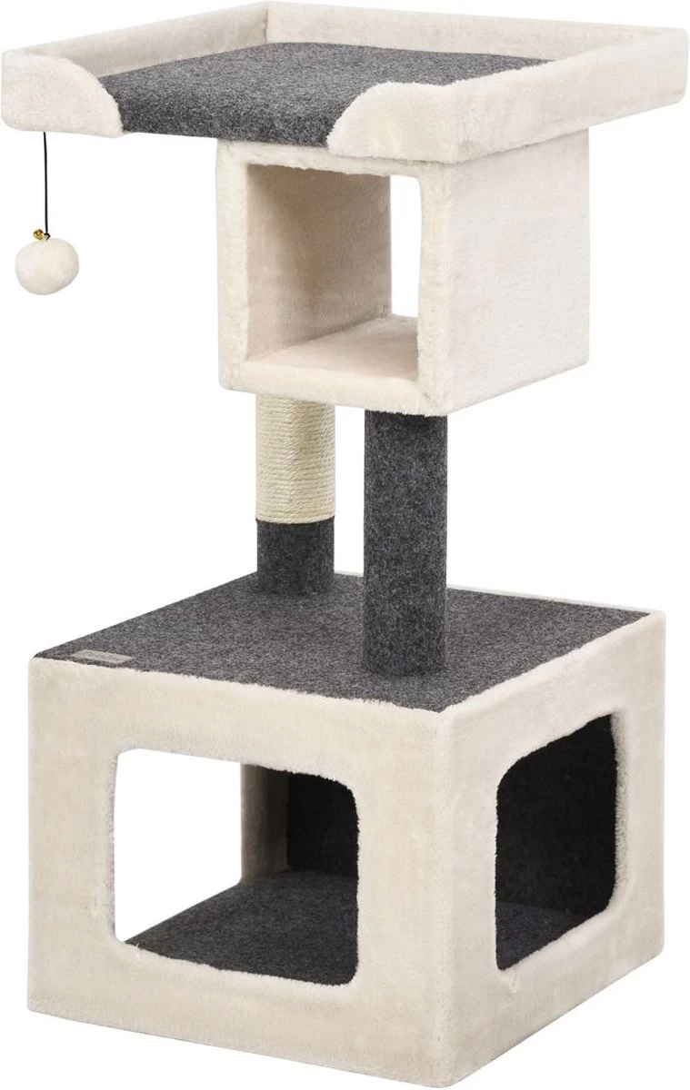 Als uw pluizige vrienden zich saai voelen in uw huis, waarom haalt u dan geen multifunctioneel katten centrum om dit probleem op te lossen? Onze 2 lagen kat activiteitencentrum zal niet in beslag nemen te veel ruimte van uw kamer, terwijl het verstrekken van veel plezier aan uw katten. Ze kunnen hun territorium overzien op de brede zitstok om de wereld te verkennen, hun krab instinct oplossen op de natuurlijke sisal paal, spelen met de bengelende bal en lekker uitrusten in de comfortabele huisjes. Met zacht pluche en vilt, zal de kattentoren uw katten superwarmte bieden. En het hele frame van de katten klimtoren is gemaakt van dik hout, waardoor het een betrouwbare stabiliteit heeft. Voltooi de installatie in enkele minuten en bevredig het natuurlijke instinct van uw kat om te klimmen en te krabben!