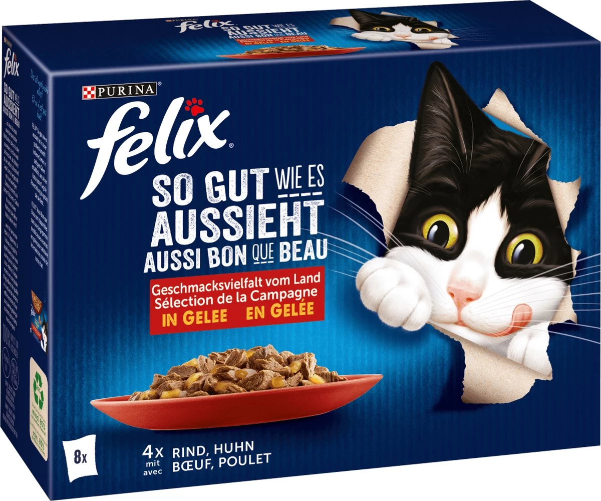 FELIX® As Good as It Looks® Beef & Chicken is een onweerstaanbare maaltijd die er net zo heerlijk uitziet, ruikt en smaakt als wanneer u hem zelf zou hebben bereid. Het is gemaakt met hoogwaardige ingrediënten, bestaat uit malse stukjes in gelei voor een heerlijke maaltijd waar uw kat dol op zal zijn! FELIX® As Good As It Looks® is verkrijgbaar in een groot aantal heerlijke varianten in sappige gelei om uw kat de afwisseling te geven waar hij elke dag van houdt.