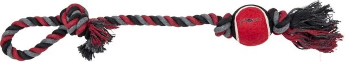 Klassieker onder het hondenspeelgoed: gewoven trektouw met een aantal knopen en een tennisbal. Dit speelgoed is multifunctioneel: je kan deze gebruiken als apport, trektouw of als kauwspeelgoed.