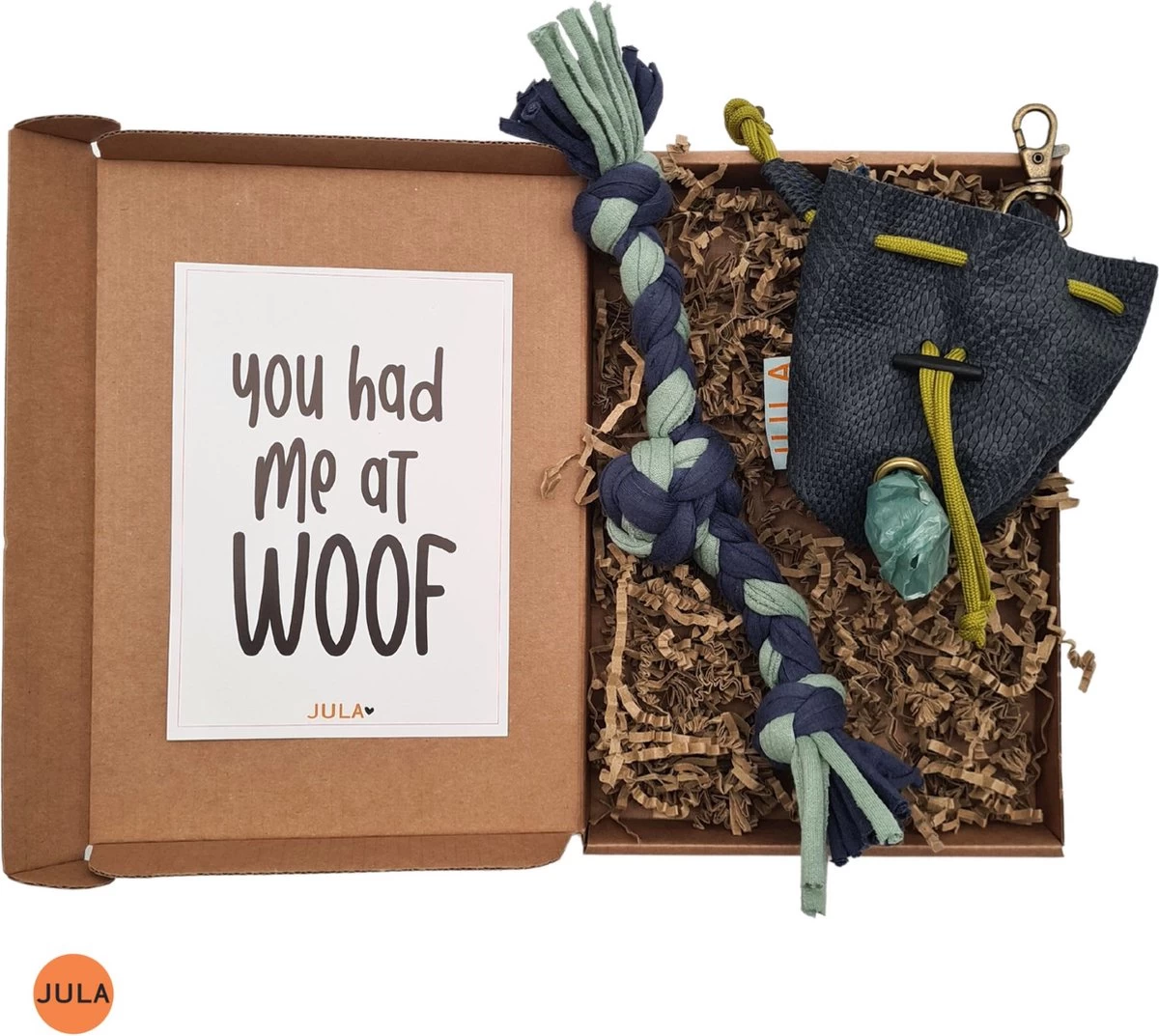 Leuk voor je eigen hondje, of als cadeautje: een flostouw en een leren zakje voor zowel poepzakjes als beloningssnoepjes.