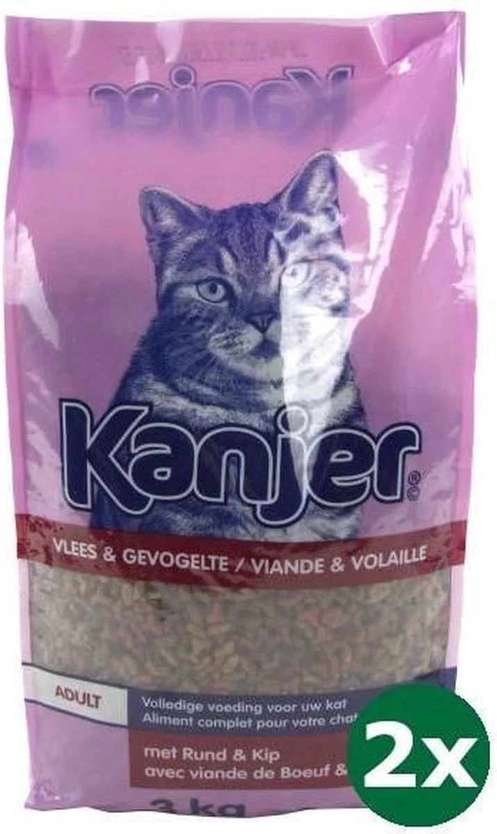 De kattenbrokken van Kanjer is een volledige maaltijd voor katten van alle rassen en leeftijden, bereidt met o.a. granen en vlees. De brokjes staan garant voor een smakelijke en heerlijke maaltijd.SamenstellingGranen, vlees en dierlijke bijproducten, plantaardige bijproducten, oliΓ«n en vetten, mineralen, vis en -bijproducten en gist.Analytische bestanddelen: Vocht 9% Eiwit 22% Vetgehalte 7% Anorganische stoffen 7,5% Celstof 3%Toevoegingen:Vitamine A 15000 IE, vitamine D3 1500 IE, vitamine E 125 mg, koper 5 mg, jodium 1,5 mg, mangaan 30 mg, ijzer 75 mg, zink 65 mgInhoud: 3 kilo