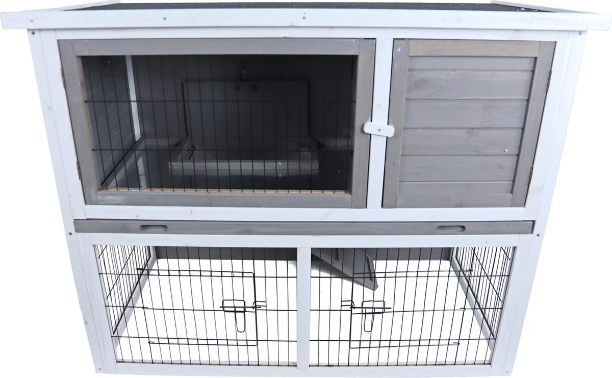 Het Boon wit met grijze houten konijnenhok met ren (twee etages) wordt als bouwpakket geleverd en is eenvoudig te monteren. Het konijnenhok heeft een lade en een nachthok en is EXTRA DIEP, voor nog meer ruimte.