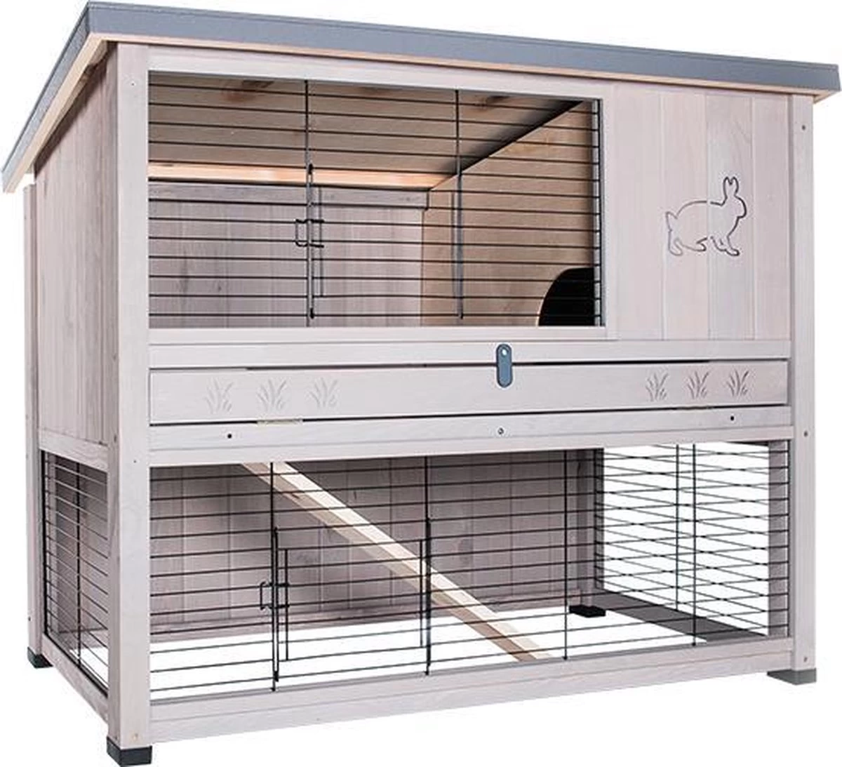 Een ruim konijnenhok van solide kwaliteit! Extra sterk en stevig en met mooie afwerking. Het dak heeft een coatingslaag, waardoor het goed beschermd is tegen neerslag. Het konijnenhok heeft 3 openingen: het dak kan geopend worden en in beide verdiepingen zit een traliewerk deurtje.