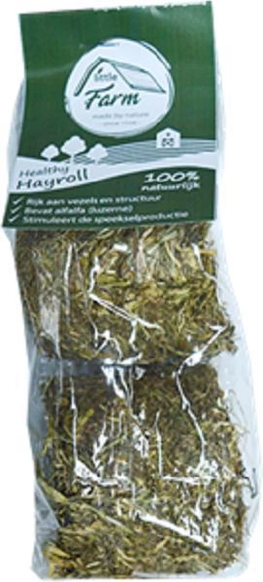 Little Farm Healthy Hayroll bestaat uit twee smakelijke rollen van weidehooi, luzerne en lijnzaadolie. Deze zijn rijk aan vezels en structuur en stimuleren de speekselproductie.
