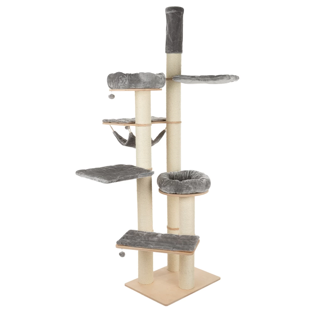 Natural Paradise is het beste bewijs van het respect van jouw baasje voor wat en wie je bent: veel meer dan een huisdier. Je bent een geliefd familielid en je verdient een aangename en gewaardeerde omgeving die aanvoelt als thuis. Daar zit onze passie. Wij zorgen er graag voor dat het huis van jouw baasje jouw natuurlijke leefruimte wordt. Zo kun je altijd jezelf zijn en je natuurlijke instincten volgen. NATURAL PARADISE. DESIGNED FOR NATURAL INSTINCTS. Wow, dat is pas een krabpaal! De krabpaal reikt tot aan de hemel! Kijk, er zijn heel veel gezellige ligmogelijkheden om uit te rusten en om de omgeving te observeren. Geen probleem als je het moet delen met andere katten. Hier is genoeg ruimte voor iedereen. En de krabpaal ziet er ook stevig uit: perfect voor knappe katten zoals jij! De krabstammen zijn veel dikker en langer dan andere krabmeubels. Daar kun je echt genieten van klauwverzorging. Probeer het maar eens! Oh, je wilt liever een tijdje chillen? Geen probleem. Je hoeft alleen maar een van de comfortabele kattenbedden te kiezen! Natural Paradise Krabpaal Amaryllis in één oogopslag: Kamerhoge krabpaal met grote ligvlakken op verschillende hoogtes Ideaal voor een huishouden met meerdere katten, maar ook geschikt voor grotere en zwaardere kattenrassen Transformeerbaar De krabpaal kan op meerdere manieren worden gemonteerd. De krabpaal past zich dus perfect aan de ruimtelijke omstandigheden aan. Hoogte individueel aanpasbaar De krabpaal kan vrij worden ingesteld op kamerhoogtes van ca. 243-265 cm.. Extra dikke en zeer lange krabpalen Met duurzame, natuurlijke sisal omwikkeld. Perfect om te klimmen en nagels te slijpen. Muren en meubilair blijven gespaard van onaangename krassporen. De bijzonder hoge krabpalen nodigen uit tot rekken en strekken tijdens het verzorgen van de klauwen. Veel ligmogelijkheden 7 ligplaatsen in verschillende variaties zorgen voor afwisseling. Ook voor gezinnen met meerdere katten bieden 2 comfortabele hangmatten, 2 zachte knuffelbedden met rand en gewatteerde platforms voldoende toevluchtsoorden om uit te rusten, te chillen en te dromen. Natuurlijke duurzame materialen De onbehandelde multiplexplaten van stabiel, Baltisch berkenmultiplex zijn afkomstig uit duurzame bosbouw.. Oeko-Tex® Standaard 100 gecertificeerd Alle bekleding is gemaakt van stoffen die getest zijn op schadelijke stoffen. Gecertificeerd textiel dat de band met de natuur benadrukt en dat je kunt vertrouwen. Verhoogde ligplaatsen: ideaal om de omgeving te observeren 7 zachte ligmogelijkheden: gevoerd en gewatteerde, klittenband houdt de ligmogelijkheden op hun plaats Kunststof voetjes ter bescherming van de vloer: helpt krassen op gevoelige vloeren te voorkomen Een afwisselend kattenparadijs Kleur: crème of lichtgrijs Materiaal: Hout: Baltisch berken multiplex Bekleding: 100% polyester (Oeko-Tex® Standard 100) Krabpalen: omwikkeld met 100% natuurlijk sisal Totale afmetingen: Als plafondkrabpaal: ca. H 243-265 x L 165 x B 112 cm (alle afmetingen zijn te vinden in de bijlage) Als krabpaal: ca. H 201 x L 165 x B 95 cm (alle afmetingen zijn te vinden in de bijlage) Let op: alleen voor gebruik binnenshuis. *Informatie over levering Aangezien het artikel in twee dozen wordt verzonden, is het mogelijk dat afzonderlijke pakketten op verschillende dagen worden geleverd. Montagevoorschrift Indien een montage van de plafondspanner niet mogelijk of gewenst is, kun je de krabpaal ook zonder monteren. Let op de montage-instructies en controleer de stabiliteit voordat je jouw kat op de krabpaal laat. Voor zeer wilde katten wordt het gebruik van een wandbevestigingssysteem (niet meegeleverd) aanbevolen.