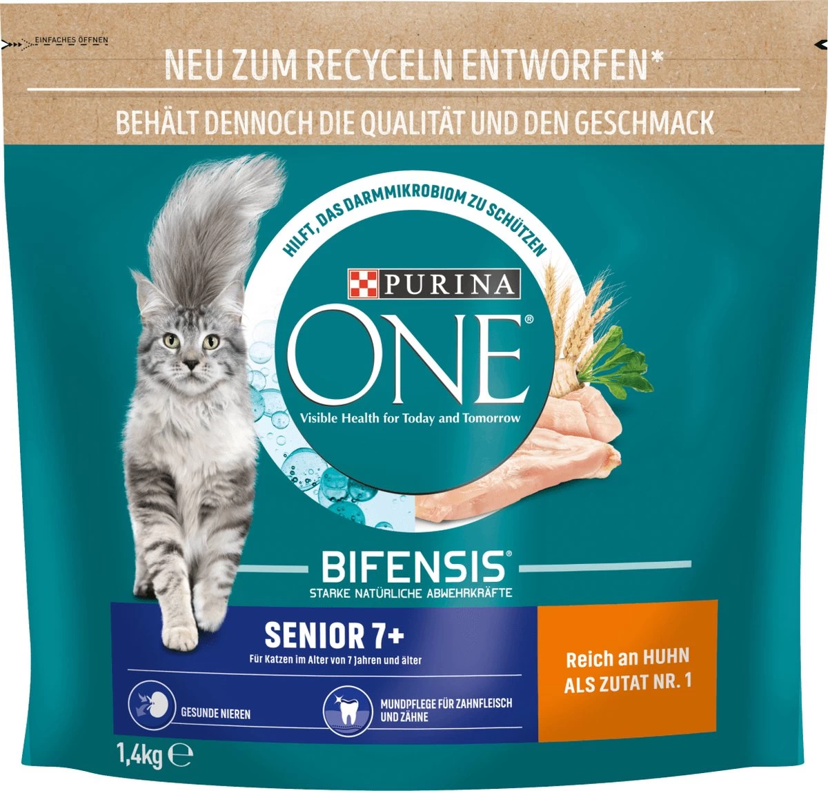 PURINA ONE® Senior 7+ rijk aan kip 1,4 kg is een voeding die speciaal is samengesteld om te voldoen aan de behoeften van katten van 7 jaar en ouder. Een evenwichtig darmmicrobioom, ook wel darmflora genoemd, is essentieel voor de gezondheid van uw kat. Het heeft een directe invloed op hun natuurlijke afweer. De PURINA ONE BIFENSIS voedingsformule bevat hoogwaardige ingrediënten, waaronder het prebioticum cichorei, dat de goede bacteriën in de darm voedt om het darmmicrobioom van uw kat te verbeteren en zijn gezondheid te behouden. Van een gereguleerde spijsvertering en een sterke, natuurlijke afweer tot een glanzende vacht, met dit voer ondersteunt u de gezondheid van uw kat.