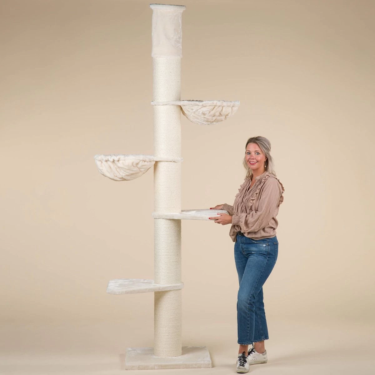 Krabpaal Plafondhoog voor grote katten Maine Coon Tower Crème Beige is met ca 36KG een zeer stevige RHRQuality krabpaal met extra dikke 20cm diameter sisalpalen. Alles wat een kat zich kan wensen. Deze krabpaal is verstelbaar 235-255 cm.