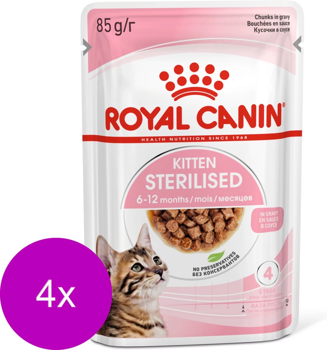Zachte textuur voor melktandenOptimale grootte van de brokjes, textuur en smaak voor opgroeiende kittens Sterk immuunsysteemVoedingsstoffen zoals vitamine C en E om de ontwikkeling van het immuunsysteem te ondersteunen Groei en gewichtscontroleAangepast vetgehalte om gewichtstoename te helpen beperken Ondersteunt de darmfloraPrebiotica en hoogverteerbare eiwitten om een gezond evenwicht in de darmflora te ondersteunen. Veel eigenaren steriliseren hun kittens vanaf de leeftijd van ongeveer 6 maanden. Binnen 48 uur na de operatie vertraagt de stofwisseling, maar het hongergevoel van je kitten neemt net toe. Omdat gesteriliseerde kittens nog steeds aan het groeien zijn, hebben ze voeding nodig die een gezonde groei ondersteunt, echter zonder onnodige gewichtstoename te stimuleren. ROYAL CANIN® Sterilised Kitten Gravy (in saus) is speciaal samengesteld om de voedingsbehoeften van gesteriliseerde kittens tijdens hun groei te ondersteunen. Deze formule is geschikt voor gesteriliseerde kittens van 6 tot 12 maanden oud, een levensfase die gepaard gaat met aanzienlijke fysieke en gedragsveranderingen. Deze voeding op maat bevat brokjes in saus met een optimale grootte, textuur en smaak voor opgroeiende kittens. Dit product bevat een matig vetgehalte om het risico op gewichtstoename te helpen beperken, terwijl het optimale hoeveelheden eiwitten, calcium en fosfor bevat voor een gezonde ontwikkeling. Daarnaast ondersteunen voedingsstoffen zoals vitamine C en E de ontwikkeling van een gezond immuunsysteem. Er is aangetoond is dat deze antioxidanten een grotere hoeveelheid en snellere toename van antilichamen na vaccinatie stimuleren. Dankzij een combinatie van prebiotica (MOS) en hoogverteerbare eiwitten helpt ROYAL CANIN® Sterilised Kitten Gravy ook een gezond evenwicht in de darmflora te ondersteunen voor een goede spijsvertering. ROYAL CANIN® Sterilised Kitten Gravy is ontwikkeld om zelfs bij de meest veeleisende kittens in de smaak te vallen. Deze natvoeding biedt een positieve zintuiglijke ervaring, ondersteunt een gezonde hydratatie en kan perfect gecombineerd worden met droogvoeding van ROYAL CANIN® Kitten. Wist je dat de voedingsbehoeften van kittens veranderen naarmate ze groeien? Op de leeftijd van 12 maanden hebben ze voeding nodig die specifiek aangepast is aan hun voedingsbehoeften als gesteriliseerde volwassen kat. Daarom raden wij aan om dan over te stappen op producten voor gesteriliseerde volwassen katten van ROYAL CANIN®. Bij Royal Canin zetten we ons in voor een betere wereld voor katten en honden. Al meer dan 50 jaar werken we nauw samen met fokkers, dierenartsen en andere deskundigen op het gebied van huisdieren, waarbij we kennis en resultaten van wetenschappelijk onderzoek delen om tot een toegewijde benadering te komen met nauwkeurig geformuleerde op maat gemaakte voeding. Al onze producten worden onderworpen aan uitgebreide kwaliteitscontroles om een optimale kwaliteit te garanderen. Wij gebruiken voedingsstoffen zonder toegevoegde kunstmatige conserveermiddelen of kleurstoffen. Kies voor ROYAL CANIN® Sterilised Kitten Gravy om voor een complete en uitgebalanceerde voeding te zorgen voor jouw kitten.
