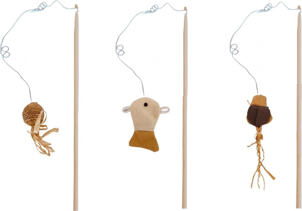 Set van 3 mooie en leuke kattenhengels Met een kattenhengel stimuleer je het reactievermogen en het jachtinstinct van je kat. Bovendien ben je zo echt samen aan het spelen! 3 verschillende designs