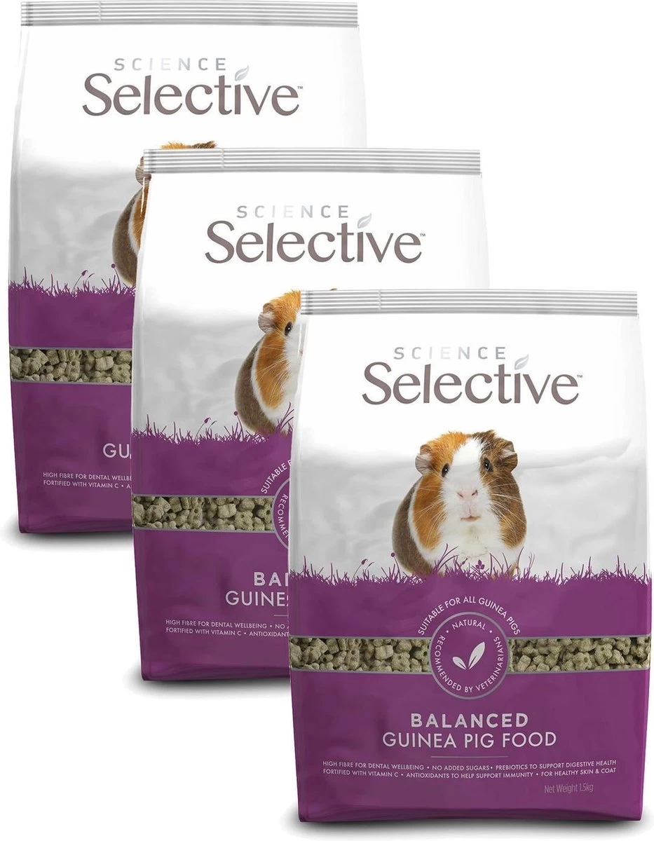 pbSupreme Science Selective Guinea Pig 3 kgbr //bPaardenbloem, venkel & brandnetel ? Een complete, evenwichtige voeding voor cavia?s.br /br /Deze mix van kruiden bevordert de natuurlijke afvloeiing van vocht. Dit verlicht constipatie, stimuleert de spijsvertering, voorkomt een opgeblazen gevoel en is goed voor een gezonde blaas./pulliVoorkomt selectief eten ? een algemeen voorkomend probleem bij veel cavia?s/liliComplete en evenwichtige voeding/liliMet toegevoegde Vitamine C ? 800mg/kg ? een essentiële dagelijkse behoefte/liliVerbetert de spijsvertering en bevordert gebitsslijtage door een optimaal vezelgehalte/liliHoog vezelgehalte ? 15% Luzerne (bekend om zijn hoge kwaliteit vezels en eiwitten)/liliBevat lijnzaad ? een uitstekende bron van Omega 3 & 6 voor een gezonde huid en vacht/liliZonder toegevoegde suikers om overgewicht te voorkomen/liliHoge kwaliteit voeding voor tevreden cavia?s/li/ulHooi en water moet altijd beschikbaar zijn.br /br /bSamenstelling/bbr /Luzerne, tarwe, tarwemeel, sojaschillen, sojaschroot, erwtenvlokken, lijnzaad (min. 2 %), bietenpulp, sojaolie, venkelzaad (min. 0.5%), zout, mineralen, paardenbloem (min. 0.25%), brandnetel (min. 0.25%), L-lysine, DL-methionine.