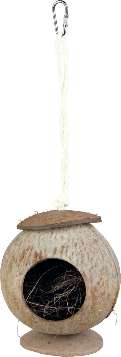 Het Trixie Kokosnoothuis Hamster 13 x 13 x 13 cm is een hangend knaagdierhuis, gemaakt van een kokosnoot en gevuld met kokosvezels. Jouw dier zal deze kokosnoot graag gebruiken om ongestoord te kunnen slapen. Naast natuurlijk is deze kokosnoot door de ronde vorm geborgen en geeft jouw dier zo een veilig gevoel. De kokosvezels binnenin zijn leuk knaagmateriaal en daarnaast heerlijk om een nestje mee te maken. De kokosnoot komt met een touwtje en haak om hem bovenin de kooi op te hangen.