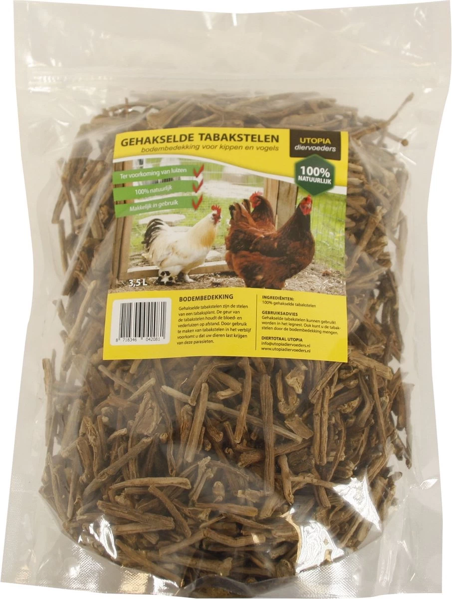 Gehakselde tabakstelen zijn de stelen van een tabaksplant. De geur van de tabakstelen houdt de bloed- en vederluizen op afstand. Door gebruik te maken van tabakstelen in het verblijf voorkomt u dat uw dieren last krijgt van deze parasieten.