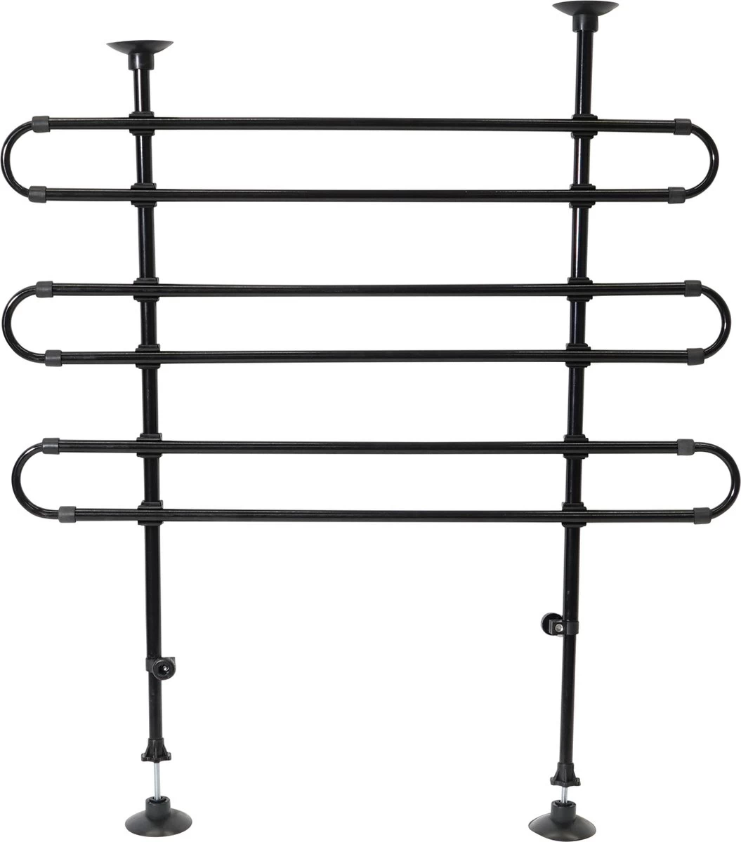 Het betreft een klemrooster welke door drukbevestiging ingeklemd wordt tussen de bodem en plafond van de auto. De uittrekbare stangen zijn individueel in te stellen in hoogte en breedte. Het is ook handig op reis zonder huisdier: Het geeft beveilig voor gestapelde tassen met het bagagerek voor de vakantie dat die niet door de auto schieten bij hard remmen. Multifunctioneel: Het rek kan ook op de zijkant tussen deurposten of trappendoorgangen worden geplaatst als beschermingsrooster zodat de hond er niet overheen gaat.